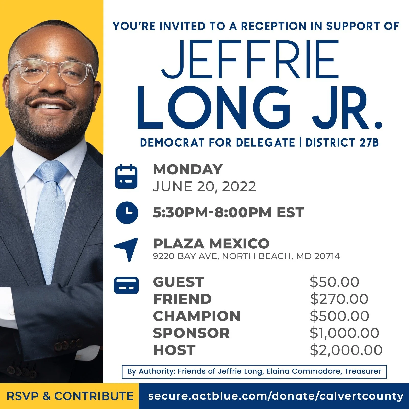 You’re invited to join Jeffrie Long Jr. at this meet & greet fundraiser. Monday June 20, from 5:30-8:00 pm at Plaza Mexico. Please RSVP online. There are multiple sponsorship levels available. See you there!
