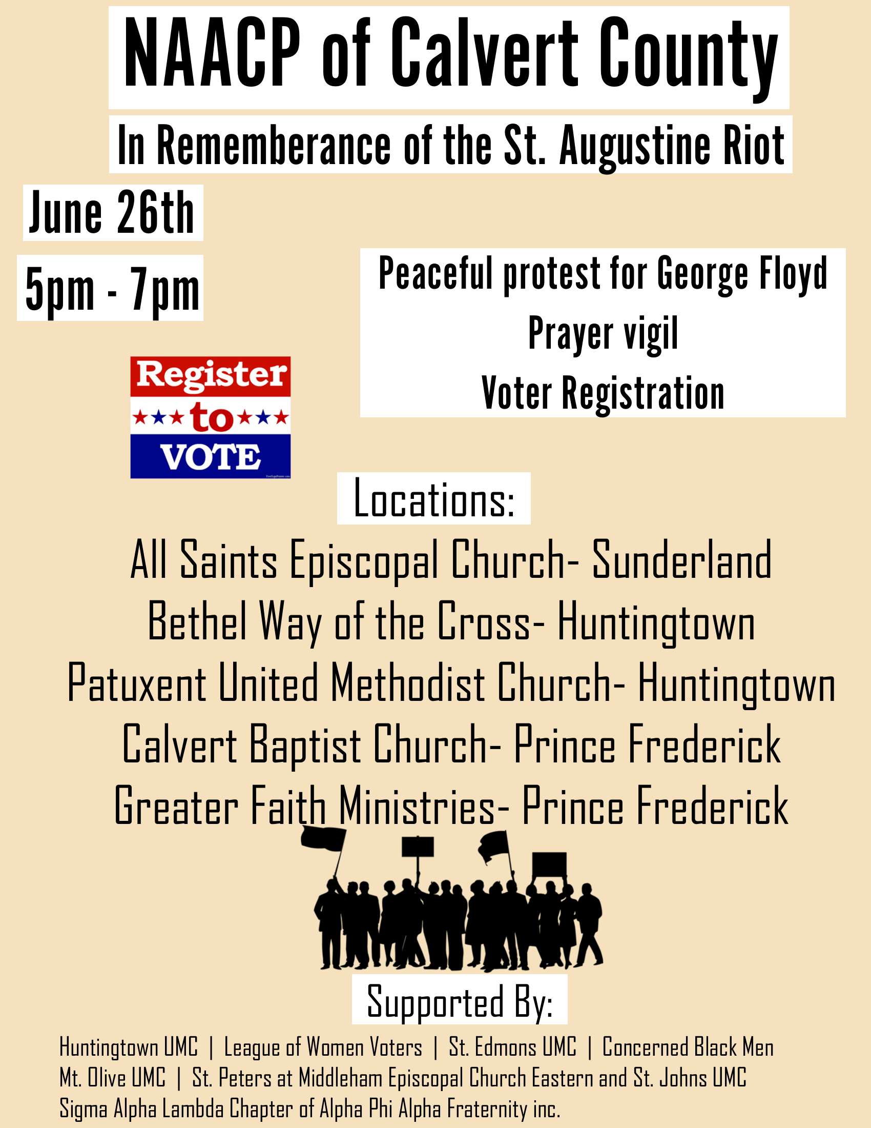 Come out and join The Calvert County NAACP for a Community Prayer Vigil this Friday, June 26th from 5-7 pm. In remembrance of the St. Augustine Riot, and in honor of George Floyd.