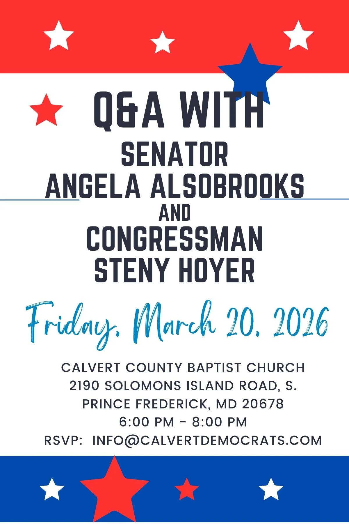 Q&A event with Senator Angela Alsobrooks and Representative Steny Hoyer. Please send RSVP to info@calvertdemocrats.com.