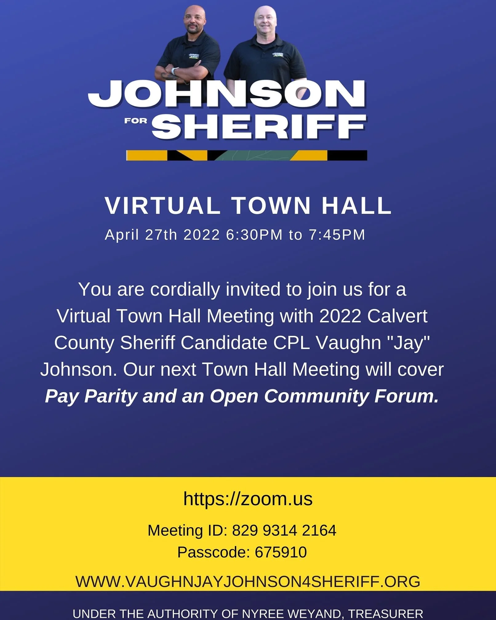 Mark your calendar for a virtual town hall meeting with candidate for Calvert County Sheriff, Vaughn Johnson.