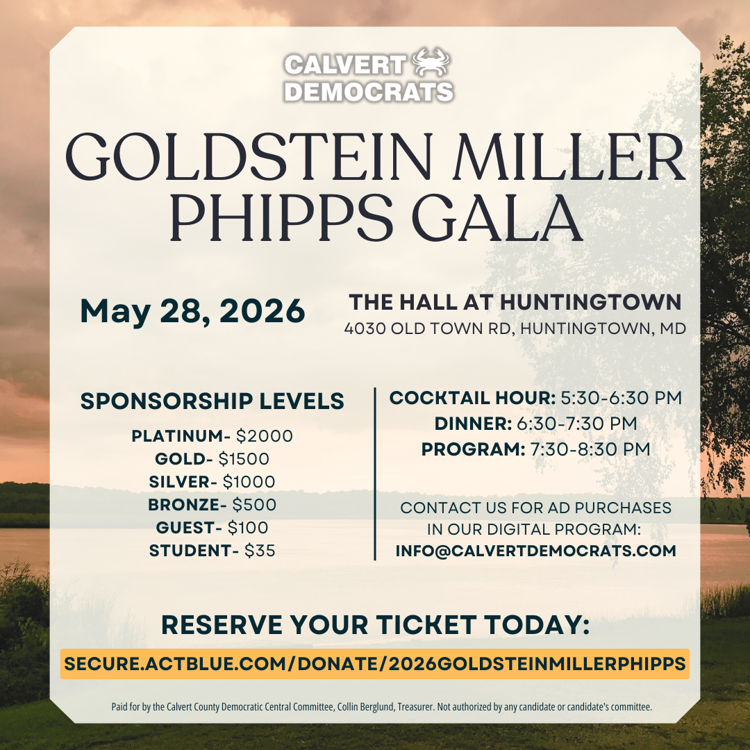 We look forward to you joining us as we celebrate and honor Calvert County Democrats, and help us support our 2026 candidates. We need you to help us as we work to promote and defend Democratic ideals in our community. We know what we are up against from the White House to our own County Leadership, and it’s essential that we are ready to provide support for candidates that will fight for us. You can help us do that, and we hope you’ll join us at the 2026 Goldstein Miller Phipps Gala!